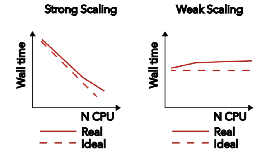 - Amdahl’s law: the speedup is limited by the fraction of the serial part of the software that is not amenable to paralleization.