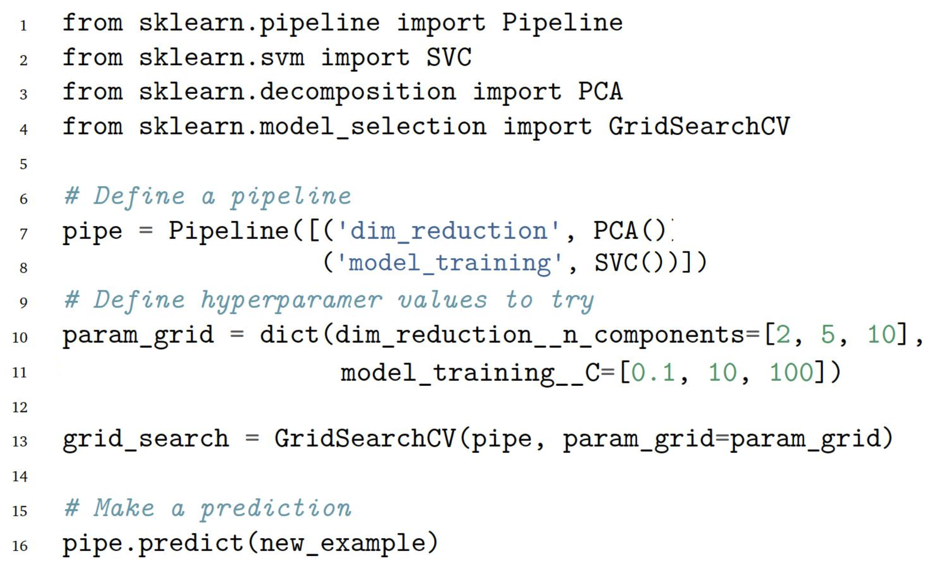 PCA n_components[2,5,10]andSVM C[0.1,10,100] - Guarantees to find the best combination of values.