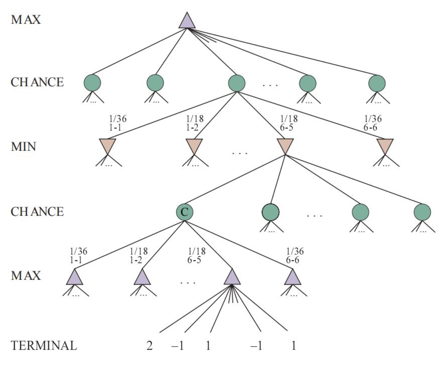 “expectiminimax value” : expected value (the average over all the possible outcomes of the chance nodes) instead of the minimax value.