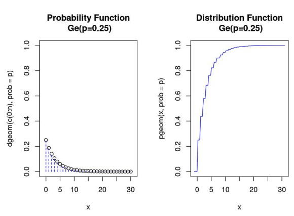 $$ P_X(x) = P(X = x) = \begin{cases} (1-p)^x \cdot p, & \text{if } x=0,1,2,\ldots \\ 0, & \text{otherwise} \end{cases} $$The random variable X defined above is said to follow a geometric distribution of p parameter. We will denote it by Ge(p). Its domain is $D_x = {0, 1, 2, 3, …}$.
