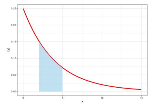 $$ f(x) = \begin{cases} \frac{1}{4} e^{-\frac{x}{4}}, & x \geq 0 \\ 0, & \text{otherwise} \end{cases} $$ The probability that the waiting time is between any two values (a,b) can be computed as $$ \int_{a}^{b} \frac{1}{4} e^{-\frac{x}{4}} \, dx. $$ e.g. between 2 and 5 minutes: $$ P(2 < X < 5) = \int_{2}^{5} f(x) \, dx = \int_{2}^{5} \frac{1}{4} e^{-\frac{x}{4}} \, dx = 0.32 $$